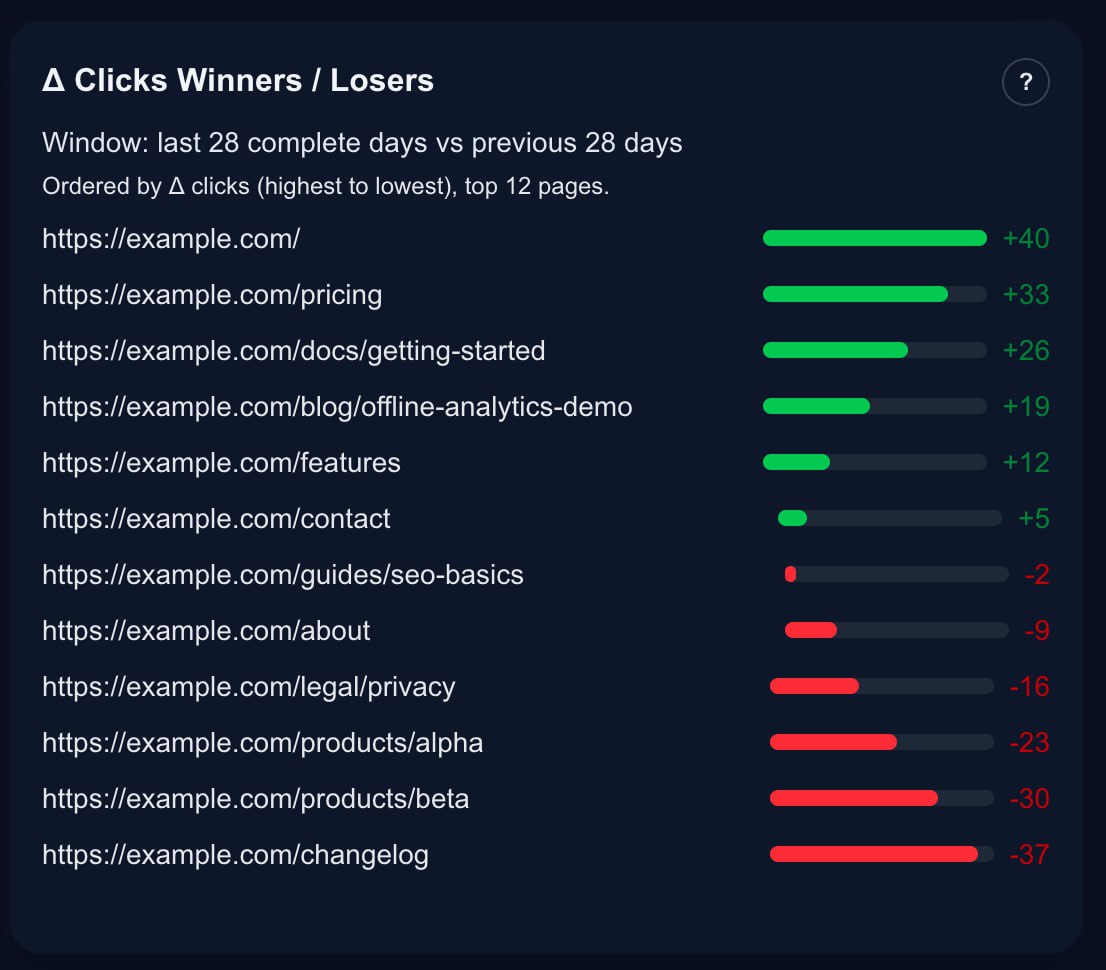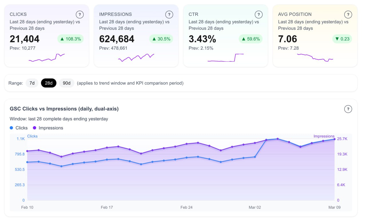 Instantly see clicks, impressions, CTR, and average position with explicit windows and trend context.
