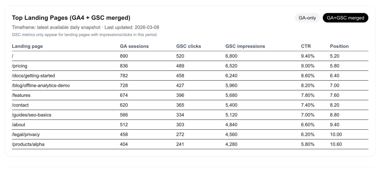 Unified GA4 + Search Console views, weekly summary (in-app), optional weekly email delivery, and actionable alerts.