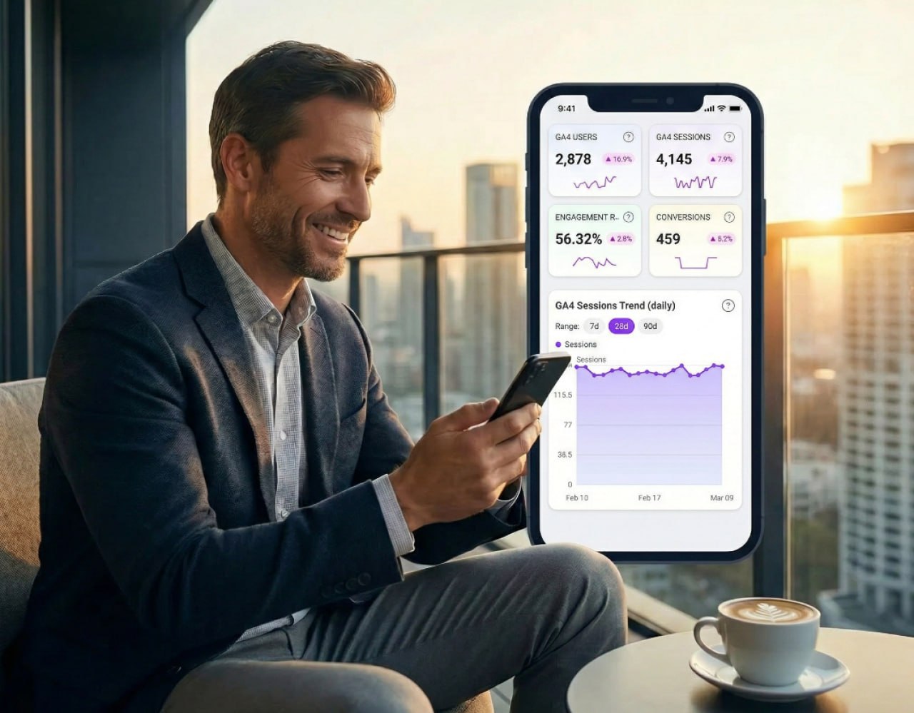 Users, sessions, engagement rate, and conversions with clear deltas and session trend over time.
