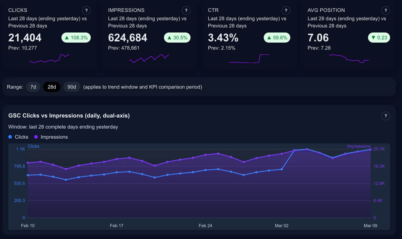 Instantly see clicks, impressions, CTR, and average position with explicit windows and trend context.