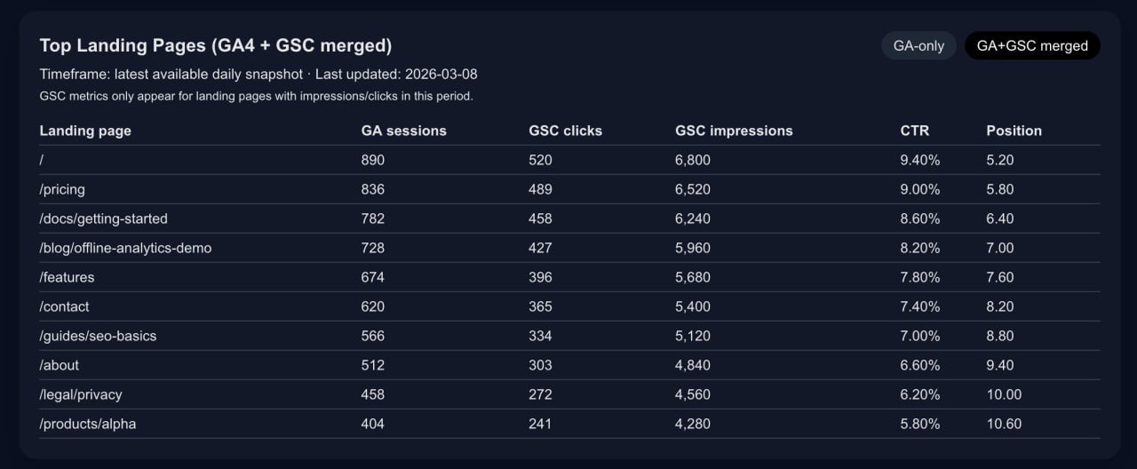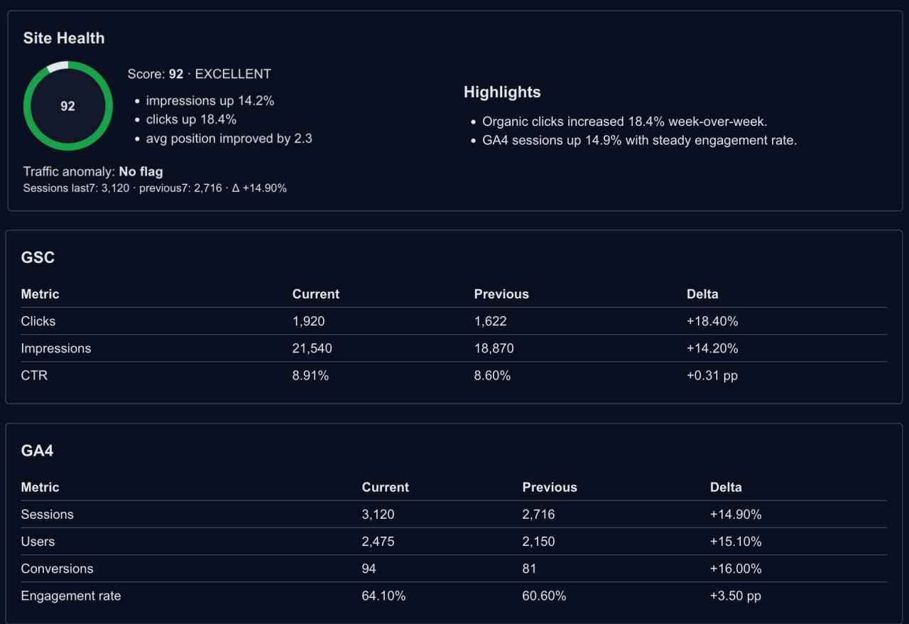 Unified GA4 + Search Console views, weekly report workflow, and actionable alerts.