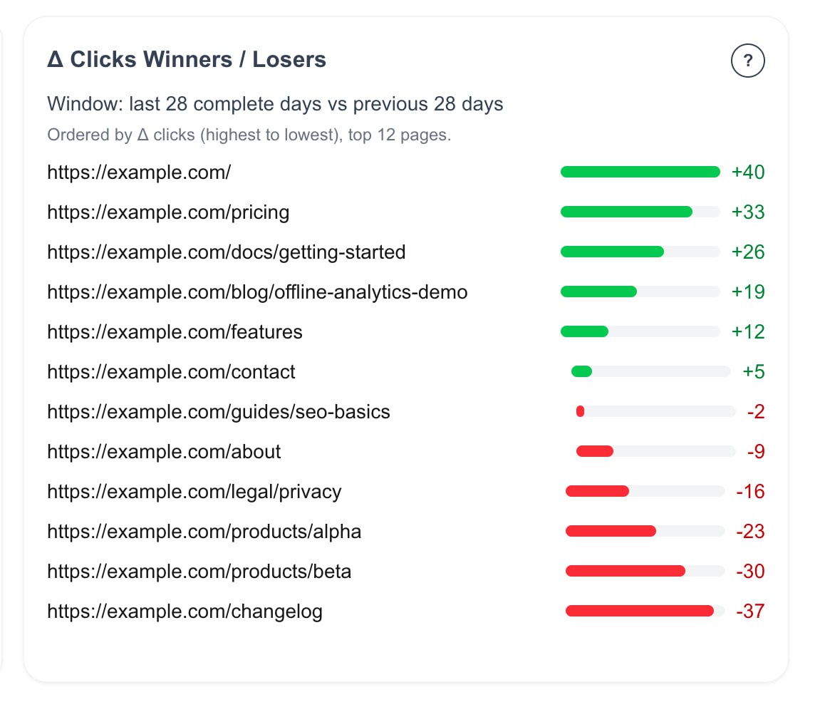 Spot page-level momentum quickly with click delta bars, so teams know what to protect and what to fix.
